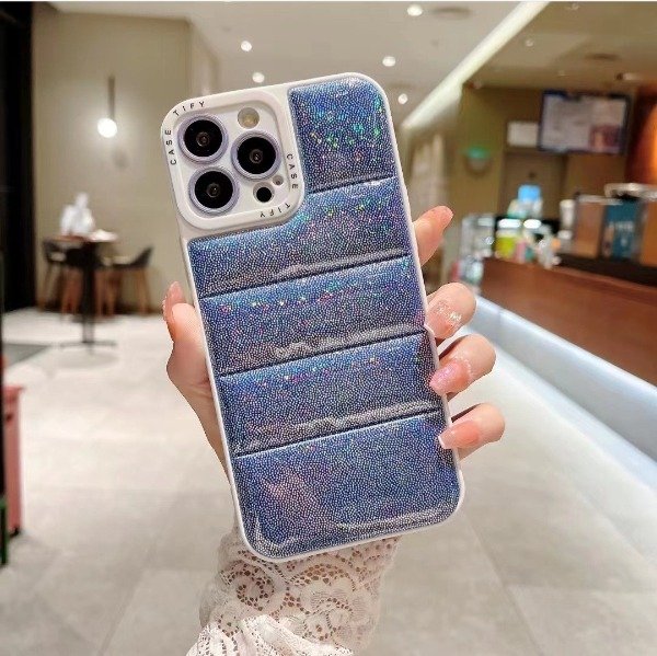 Funda puffer para Iphone 14 ,azul brillosa borde blanco reforzadas, protector de cámara