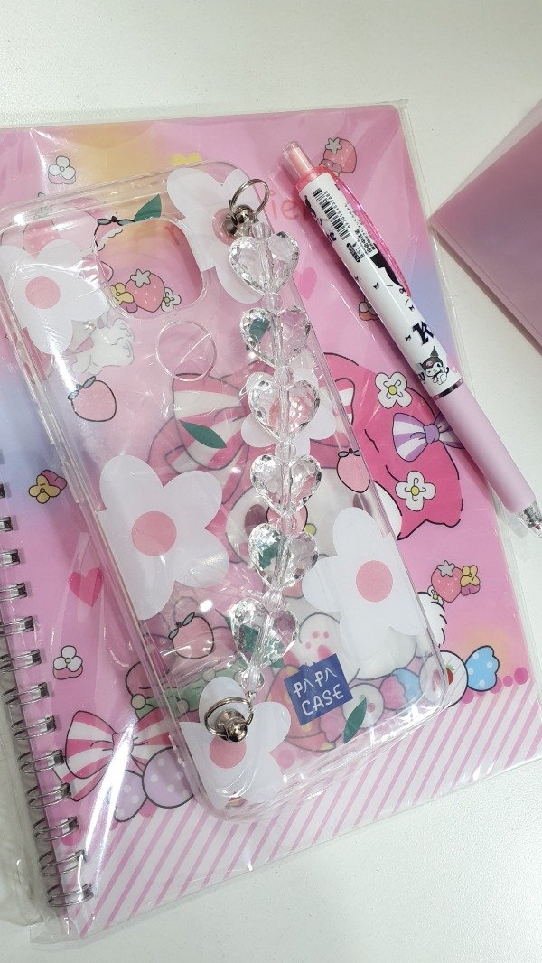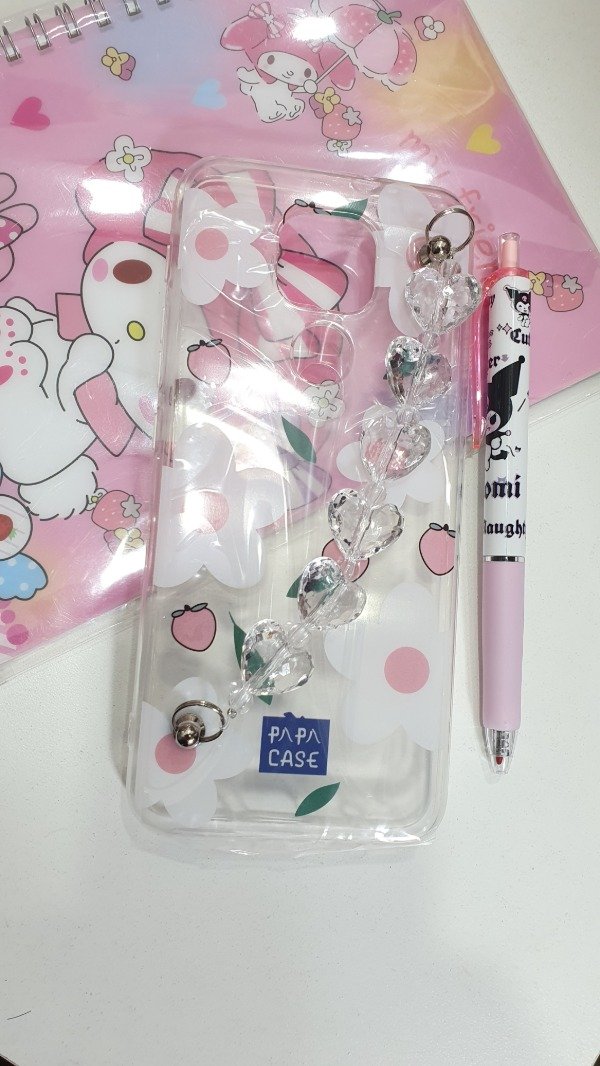 Funda transparente, estampado flores ,cadena corazones transparente