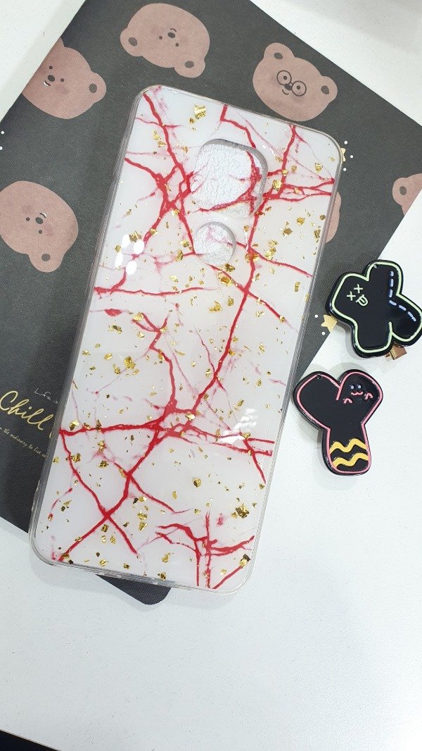 Funda tpu ,borde de la fundita transparente, estampado líneas bordo y brillos dorados