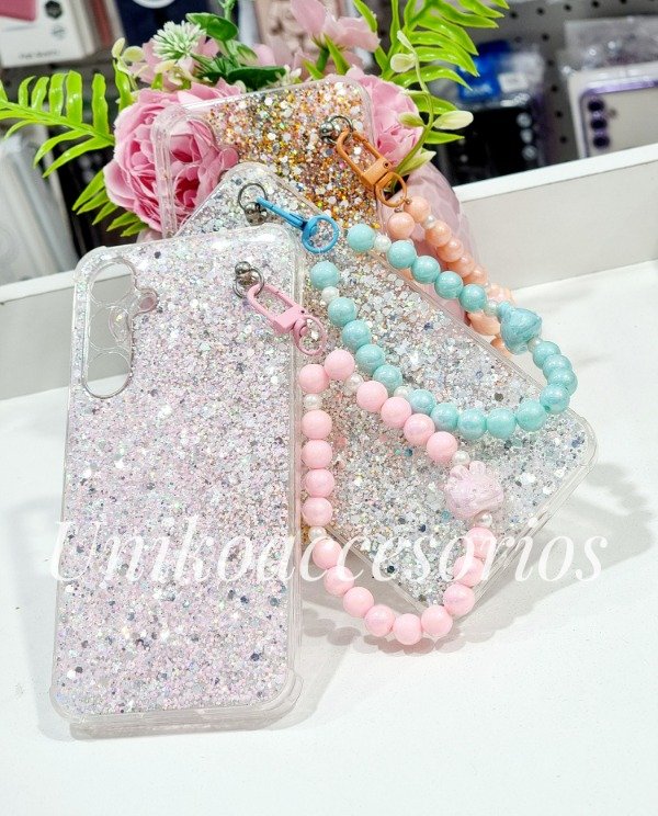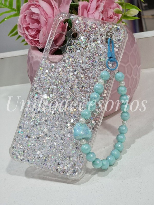 Funda gliter, turquesa,con pulsera y protector de cámara