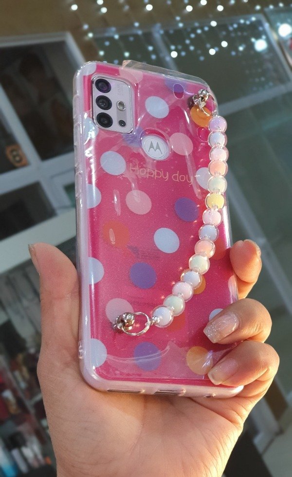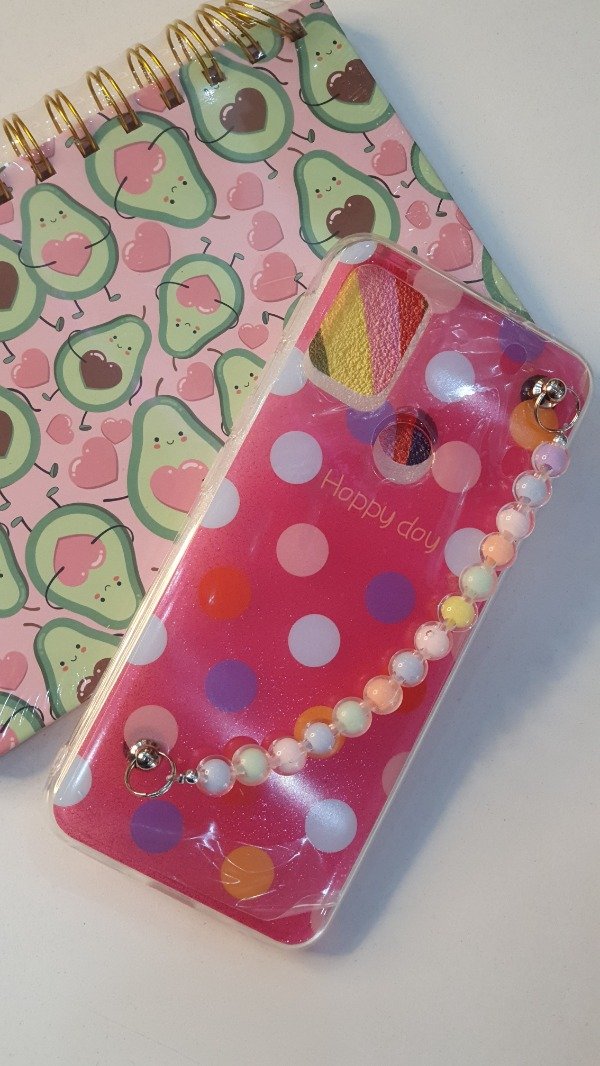 Funda tpu ,estampado circulos coloridos ,cadena pulsera esferas multicolor
