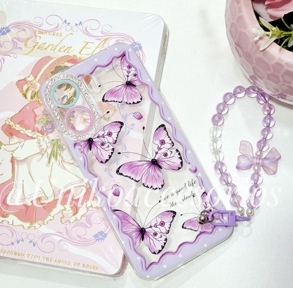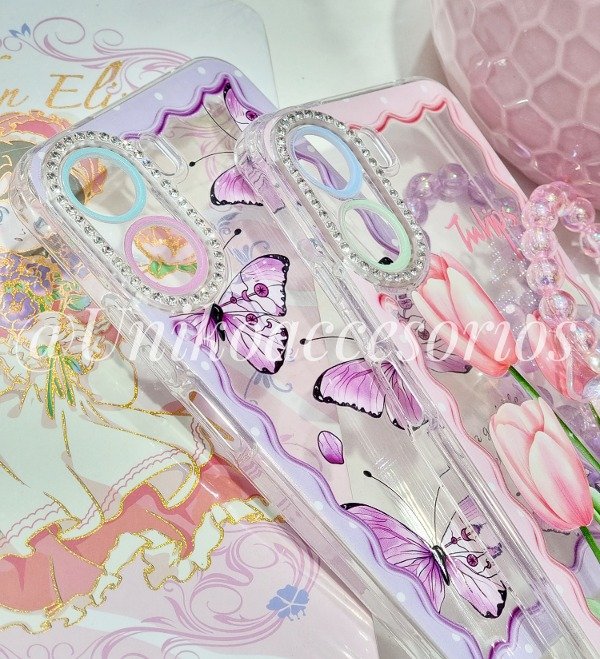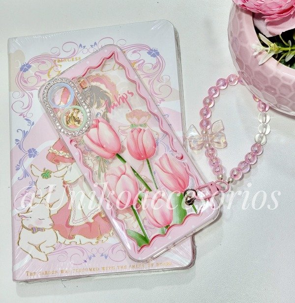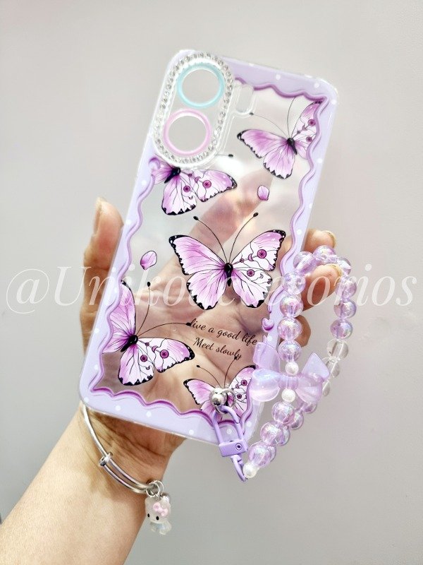 Funda tp transparente estampada , esquinas Antishok, con protector de cámara brillosa, piedras strass fantasía, con pulsera colgante