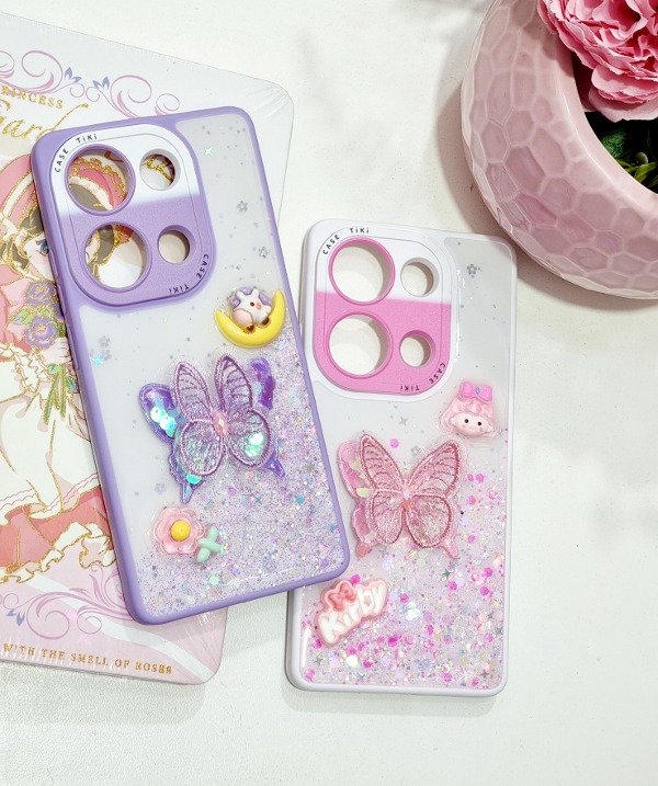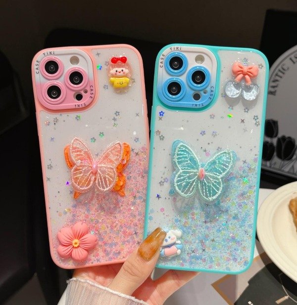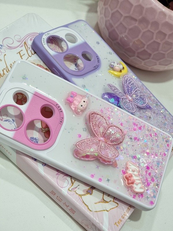 Funda rígida brillosa con protector de cámara y apliques 3d , una linda mariposa de encaje