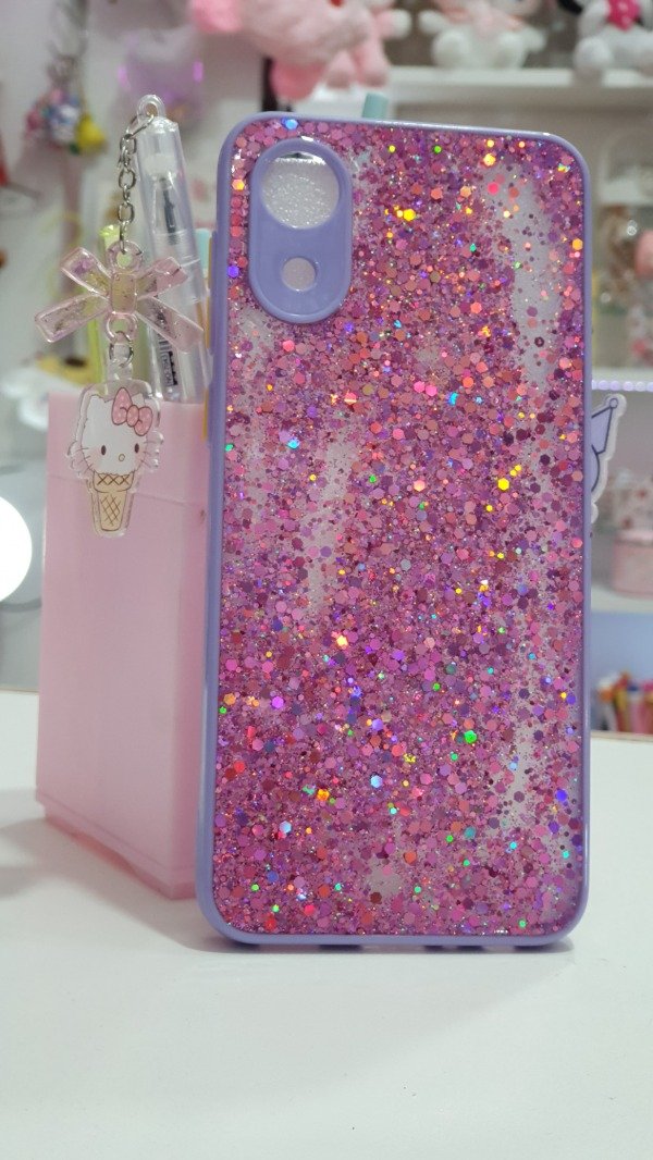 Funda brillosa ,brillos color rosa ,borde de la funda violeta clarito