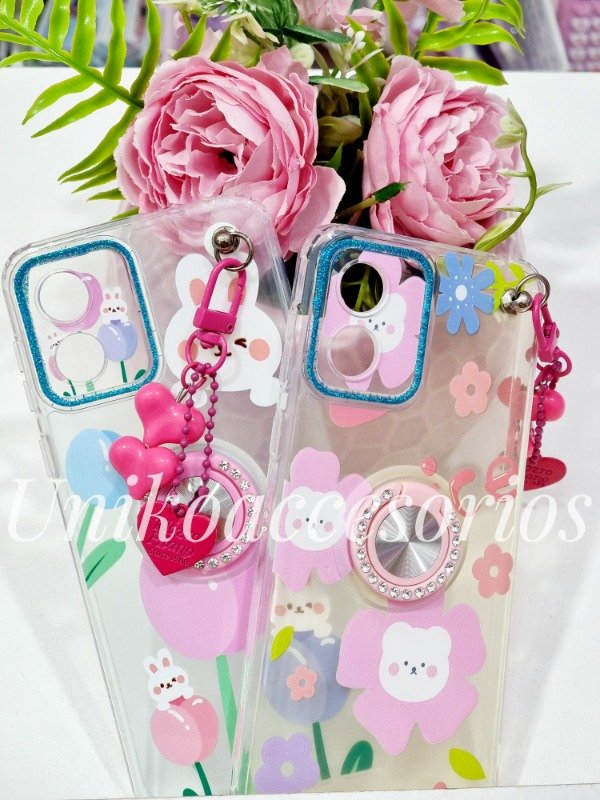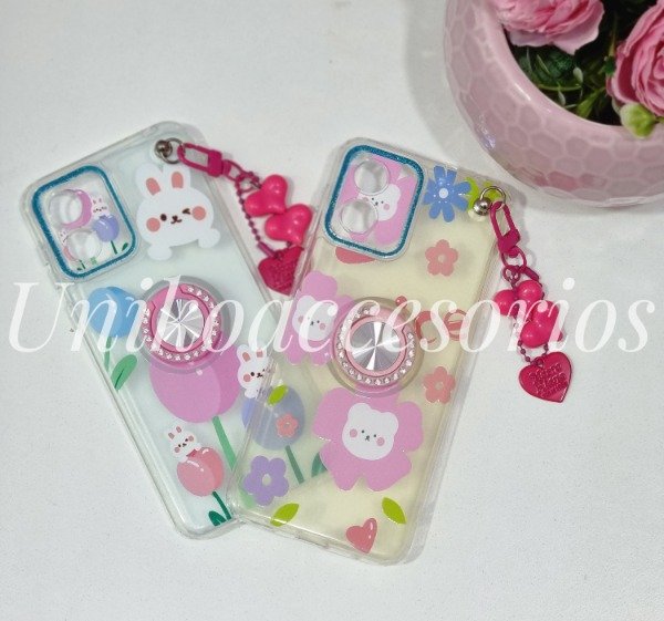 Funda tpu transparente estampado, ring incorporado, protector de cámara y llaverito