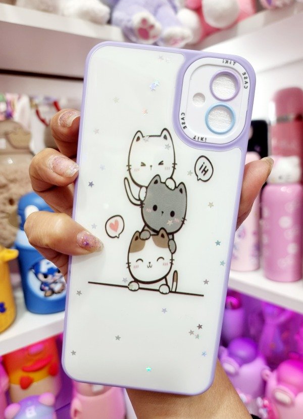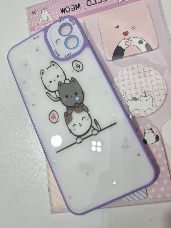 Funda borde rígida violeta ,protector de cámara, estampado de tres lindos gatitos