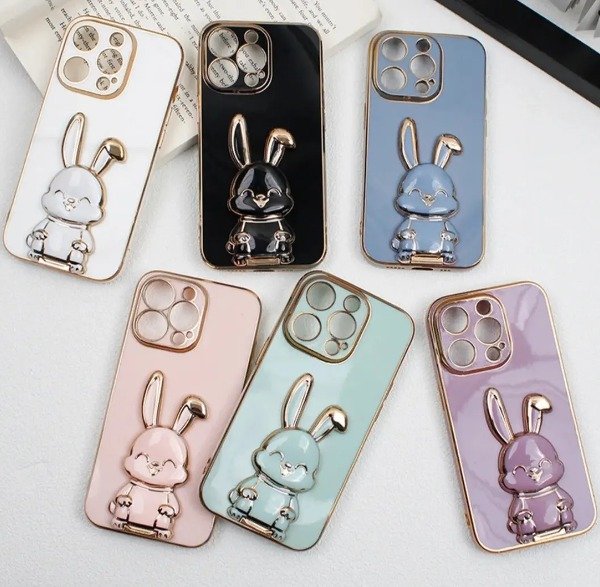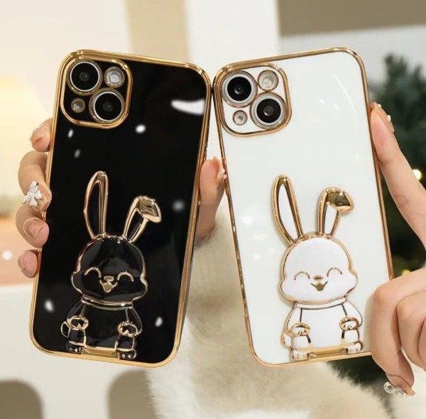 Funda con soporte de 🐰 conejo, y protector de cámara, bordes dorado