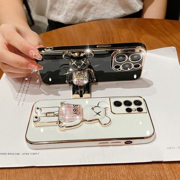 Funda con protector de cámara,bordes dorado y holder muñeco 3D ( imagen ilustrativo, te llegará para el modelo de tu celular)
