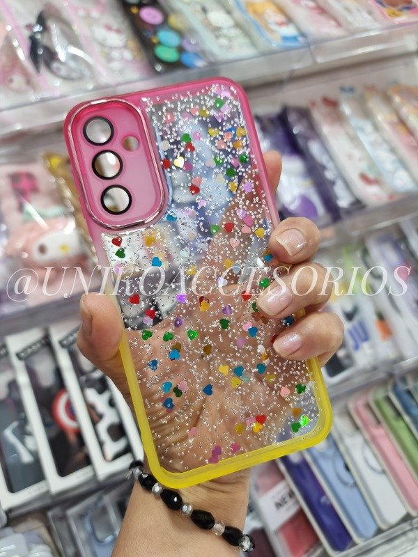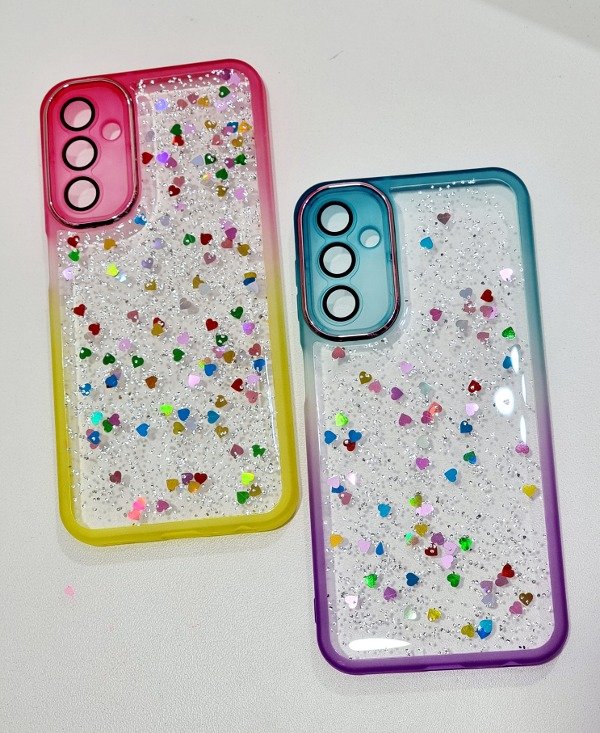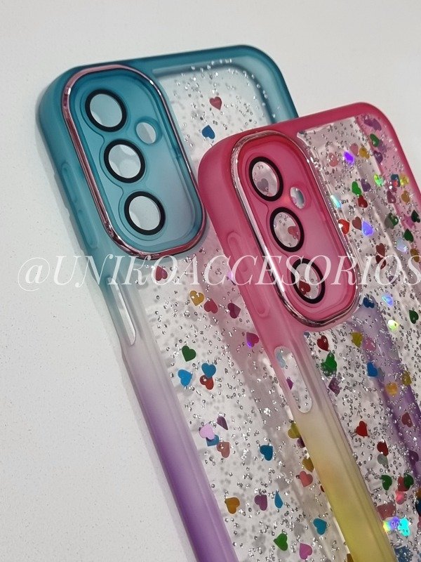 Funda brillosa con corazones pequeños y protector de cámara, color en degradado