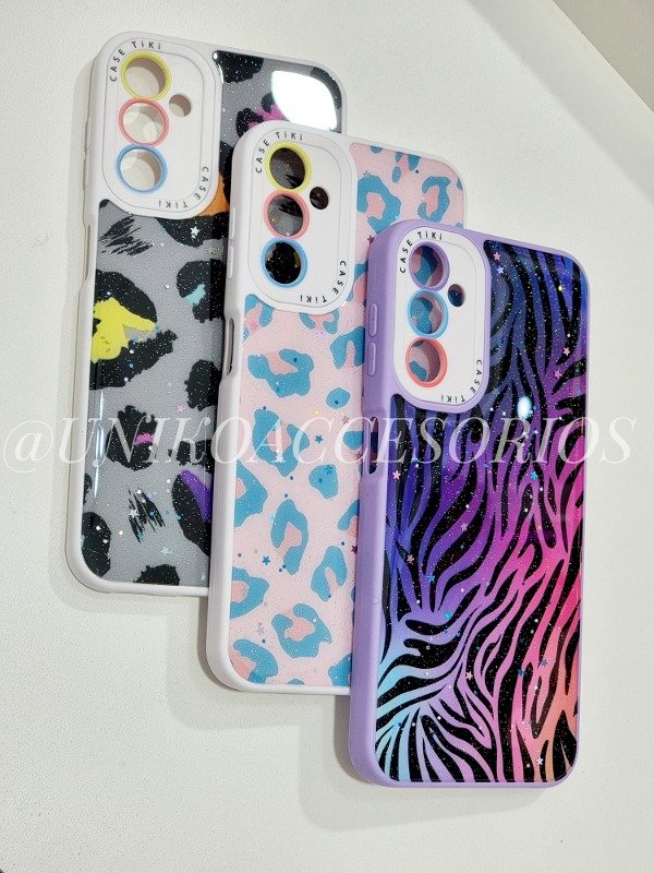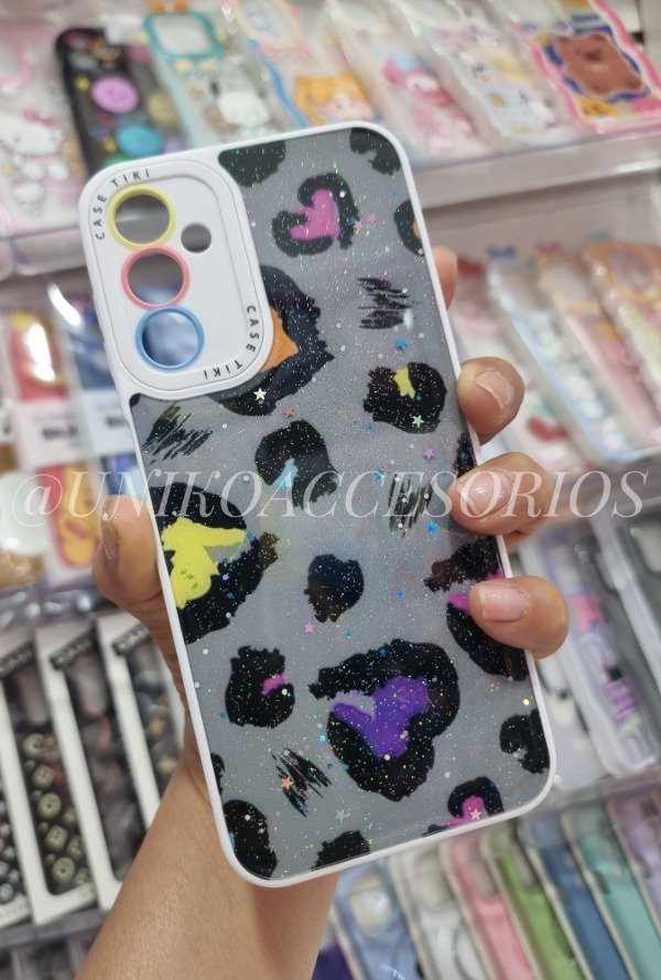 Funda estampado brillosa ,bordes blanco y protector de cámara